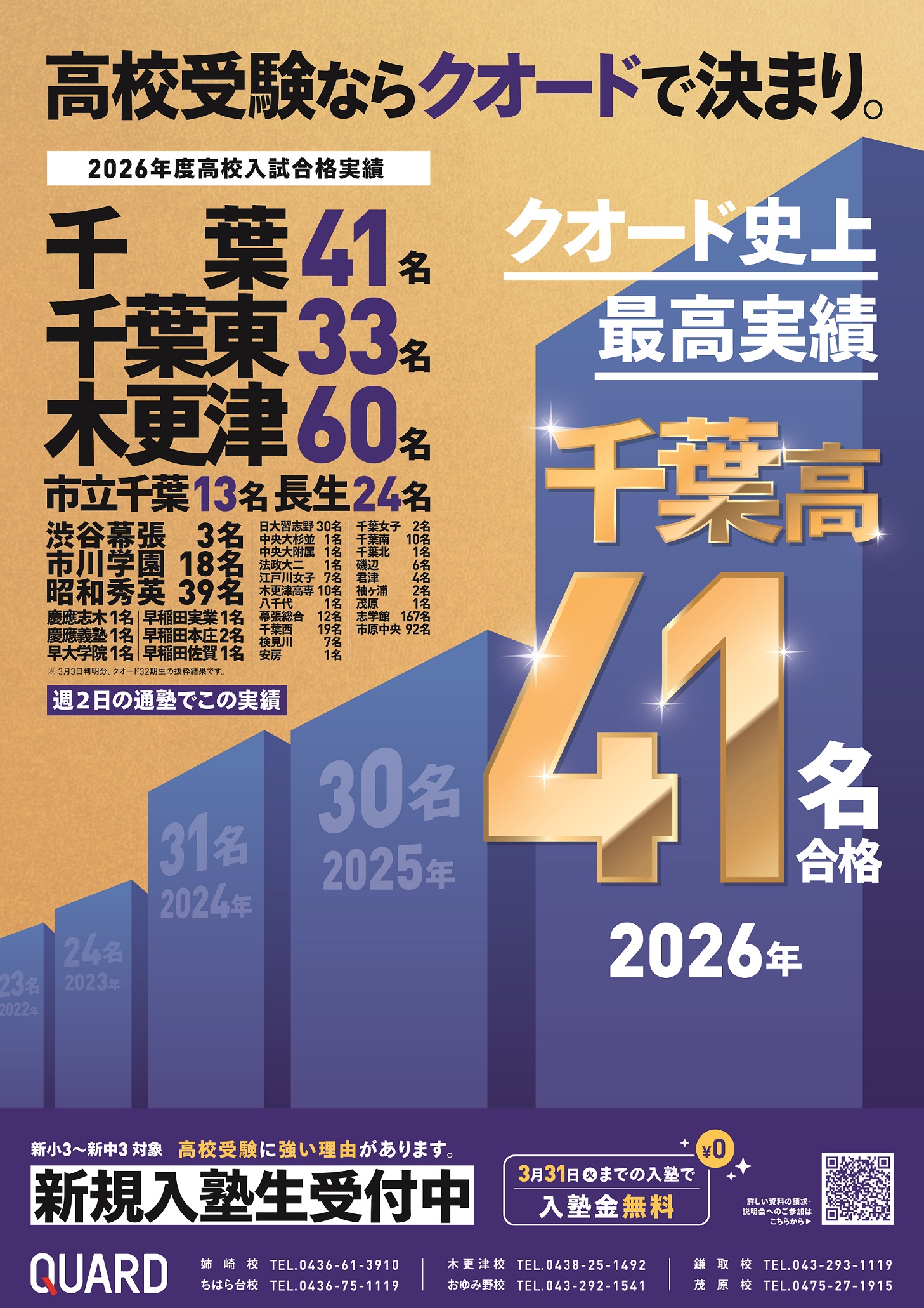クオードでは入塾時に標準的な成績だったお子様が千葉高や千葉東高の合格を勝ち取る、あるいは入塾時には勉強に苦手意識のあったお子様が木更津高や長生高など地域トップ高の合格を勝ち取ることが毎年多く見られます。