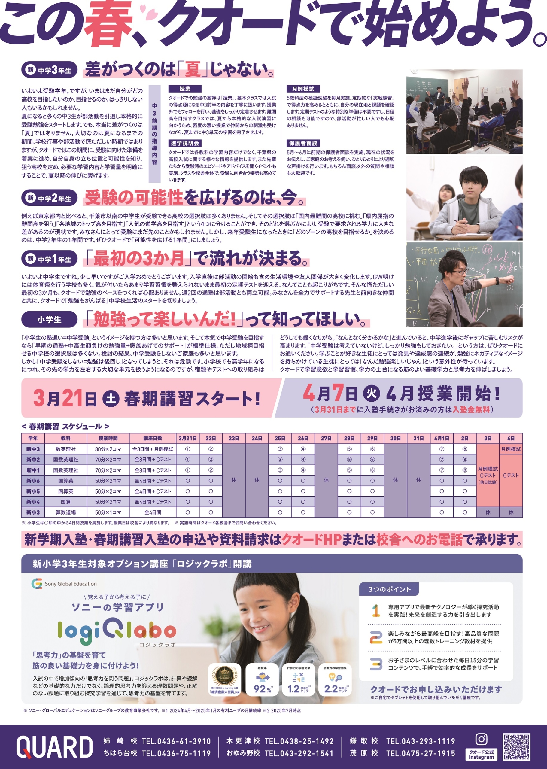 春期講習は3月21日(土)スタート。(※小中学校の授業がある3月23日(月)と24日(火)には授業がありません。)各学年の授業時間やクオードの様子が詳しくわかるガイドブック一式を用意しておりますので、お気軽にお問い合わせください。校舎の見学も大歓迎です。