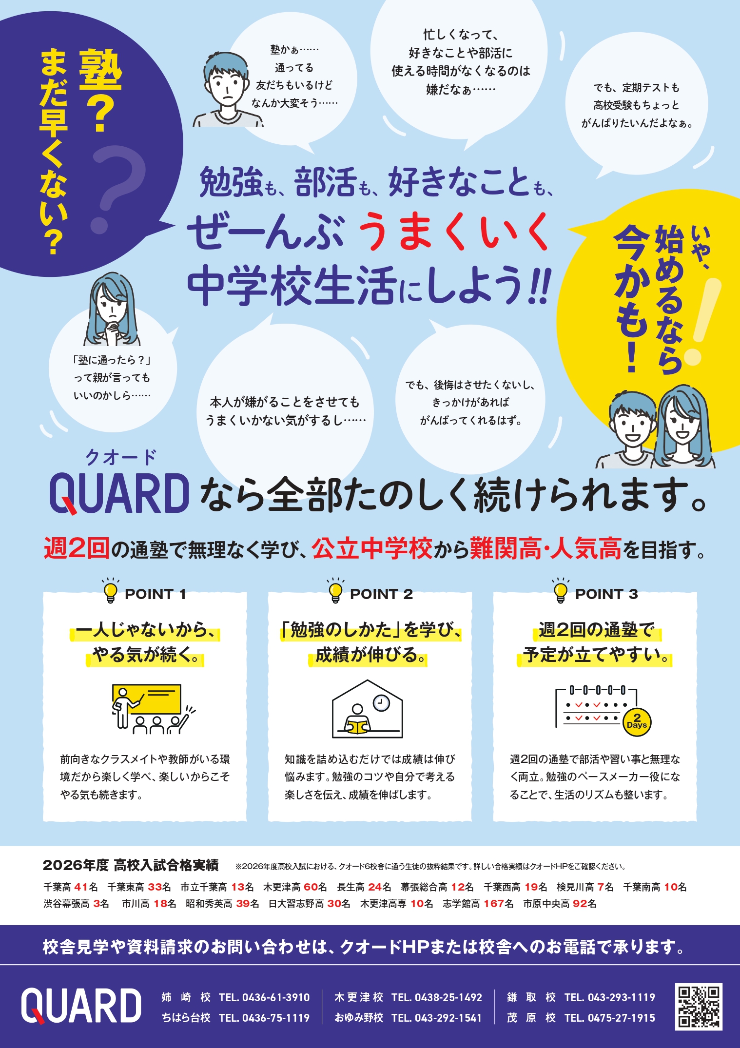 また、クオードに興味のある保護者の方を対象としたクオード説明会も開催します。こちらもぜひご参加ください。詳しくは各校舎までお電話でお問い合わせください。