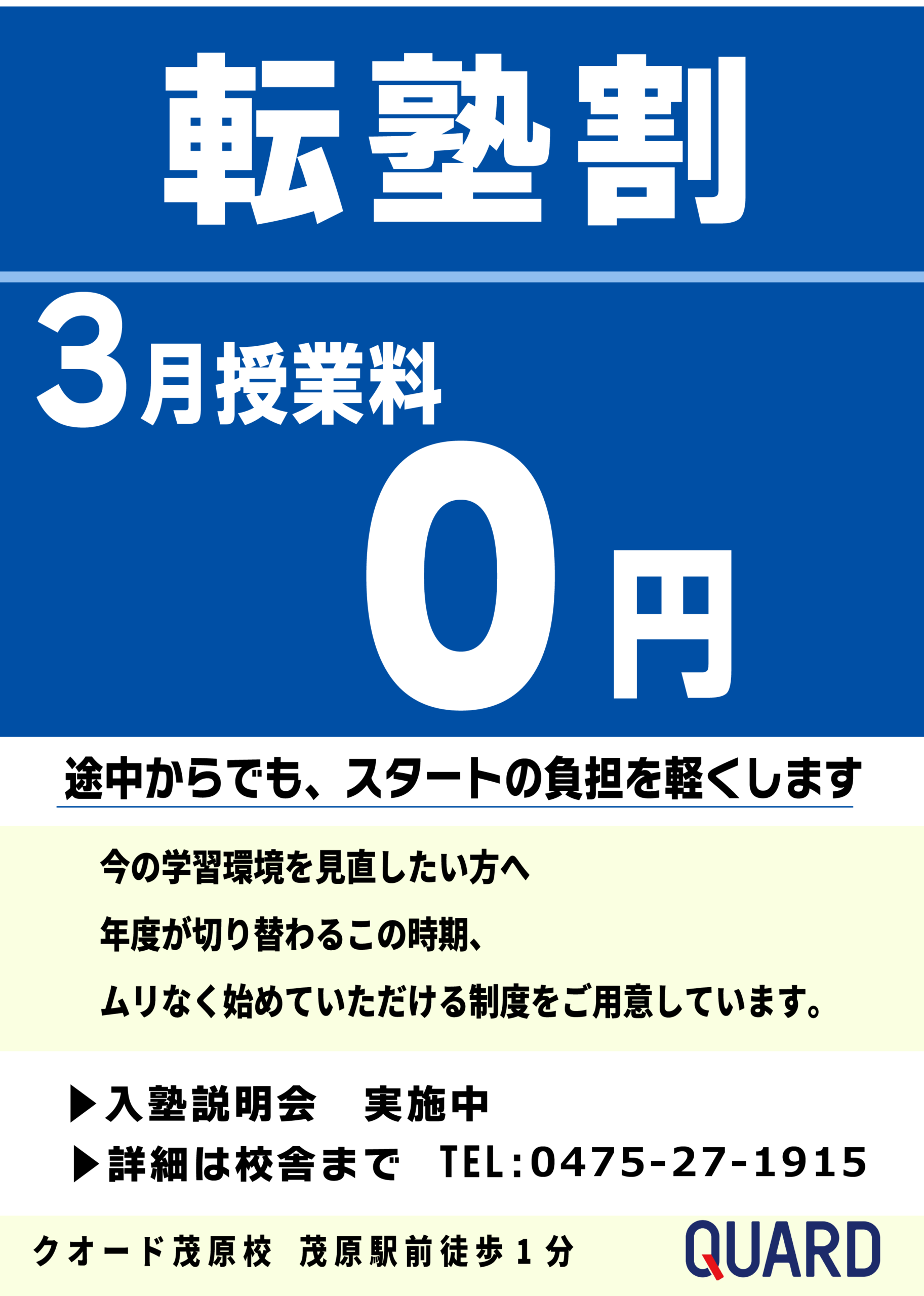 そこで、クオード茂原校では、スタート時の負担を少しでも軽くするために「転塾割(3月授業料0円)」をご用意しました。
